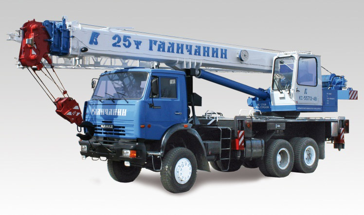 Кран стреловой автомобильный КС-55713-4В грузоподъемностью 25 тонн монтируется на шасси автомобилей КамАЗ-65111. Предназначен для погрузочно-разгрузочных и строительно-монтажных работ на рассредоточенных объектах. Шасси обладает отличной маневренностью, и легкостью управления, что позволяет использовать кран на объектах с различными типами подъездных путей, а малые габариты делают его пригодным для эксплуатации в стесненных условиях современных городов.