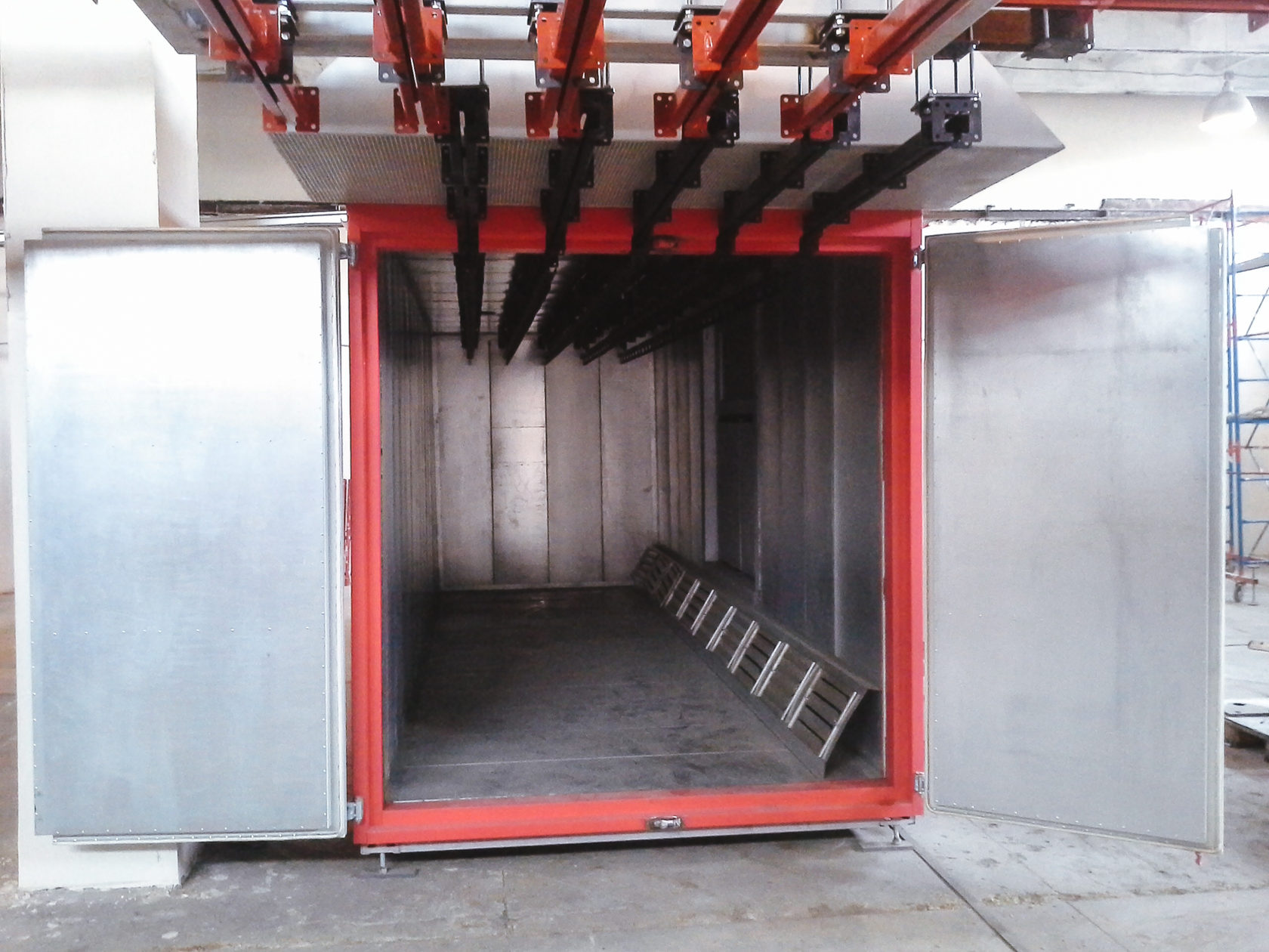 - Комплектация транспортной системой (верхней или нижней) для перемещения окрашиваемых изделий из камеры покраски в печь полимеризации;