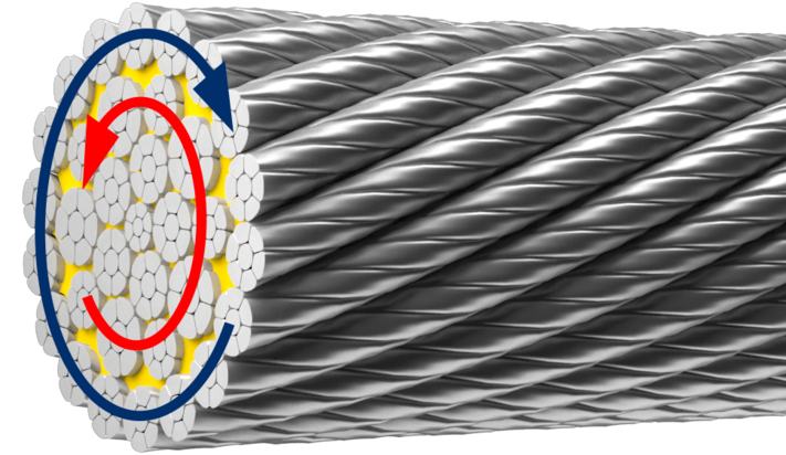 Многопрядные канаты Anaconda изготавливаются по специальной технологии, в которой внутренние и наружные пряди скручиваются в противоположных направлениях. Таким образом создается эффект уравновешивания и канат не обладает крутимостью даже при подъеме груза на большую высоту. Большое количество прядей делает канат гибким и эластичным, что делает его более удобным при эксплуатации.