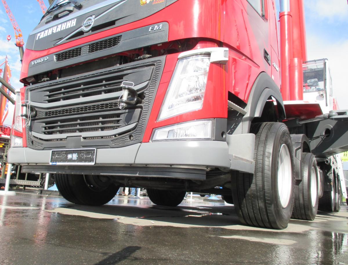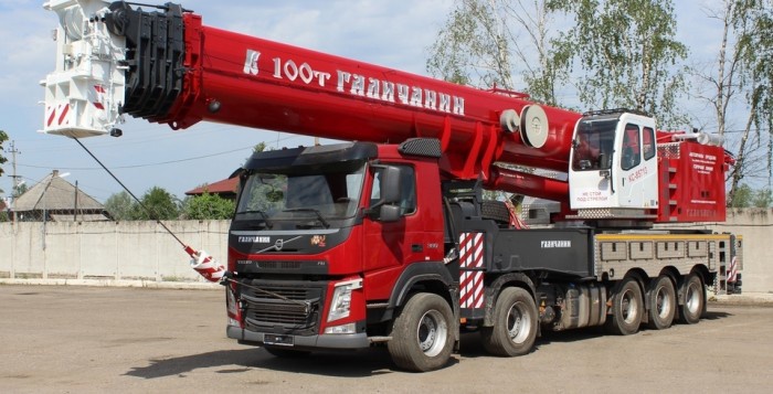 Кран автомобильный КС-85713 грузоподъемностью 100т монтируется на шасси автомобильного типа Volvo FM13 с колесной формулой 10 х 4 и предназначен для погрузочно-разгрузочных и строительно-монтажных работ на рассредоточенных объектах. Шасси обладает большой несущей способностью, надежностью и легкостью управления, что позволяет использовать кран на объектах с различными типами подъездных путей.