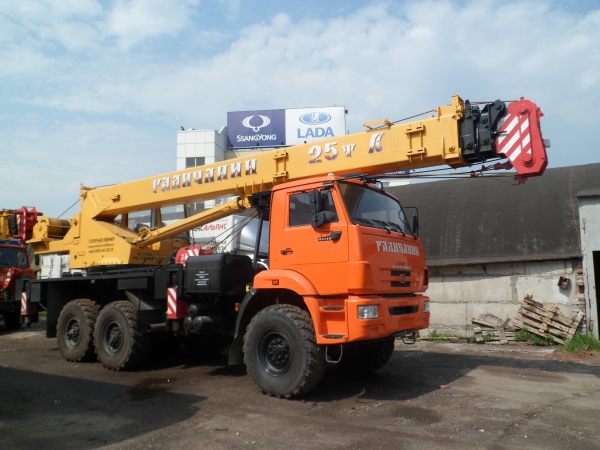 Кран стреловой автомобильный КС-55713-5В грузоподъемностью 25 тонн монтируется на вездеходных шасси автомобилей КамАЗ-43118. Предназначен для погрузочно-разгрузочных и строительно-монтажных работ на рассредоточенных объектах. Шасси обладает отличной маневренностью, и легкостью управления, что позволяет использовать кран на объектах с различными типами подъездных путей, а небольшие габариты делают его пригодным для эксплуатации в стесненных условиях современных городов.