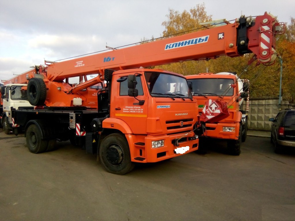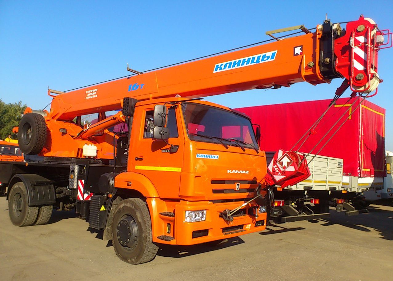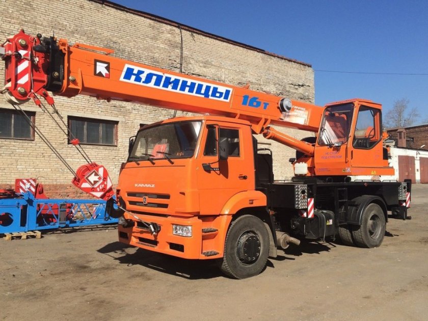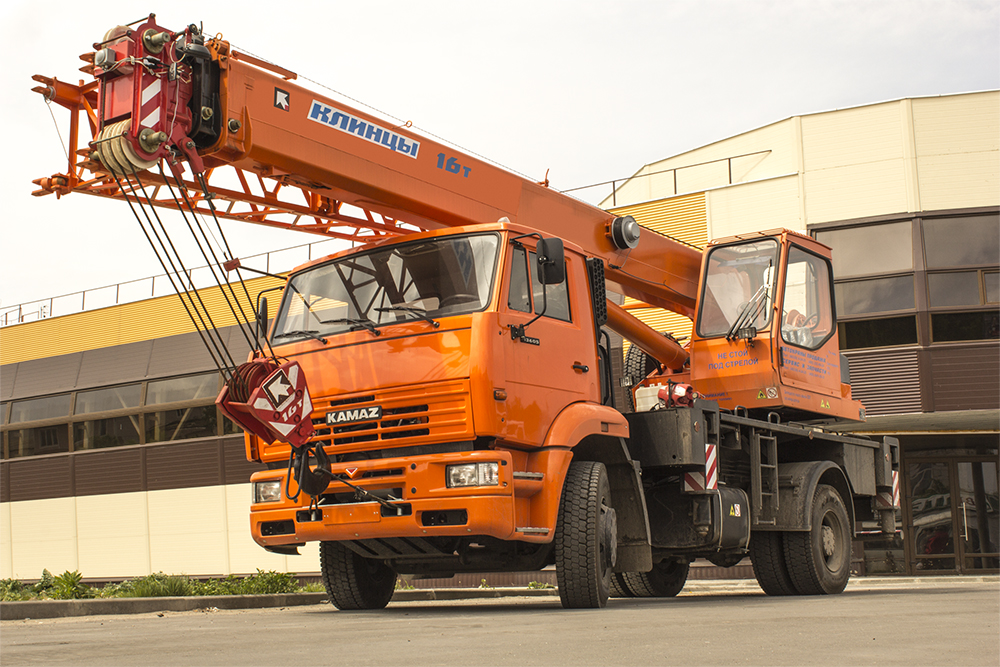 Кран стреловой автомобильный КС-35719-8А грузоподъемностью 16 т монтируется на шасси автомобилей КамАЗ-53605. Предназначен для погрузочно-разгрузочных и строительно-монтажных работ на рассредоточенных объектах. Шасси обладает отличной маневреннностью и легкостью управления, что позволяет использовать кран на объектах с различными типами подъездных путей, а небольшие габариты делают его пригоджным для экстлуатации в стесненных условиях современных городов. Кран может работать в зоне 360 градусов.