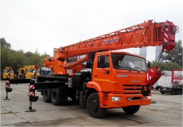 Кран стреловой автомобильный КС-55713-1К-1 грузоподъемностью 25 тонн монтируется на шасси автомобиля КамАЗ-65115.