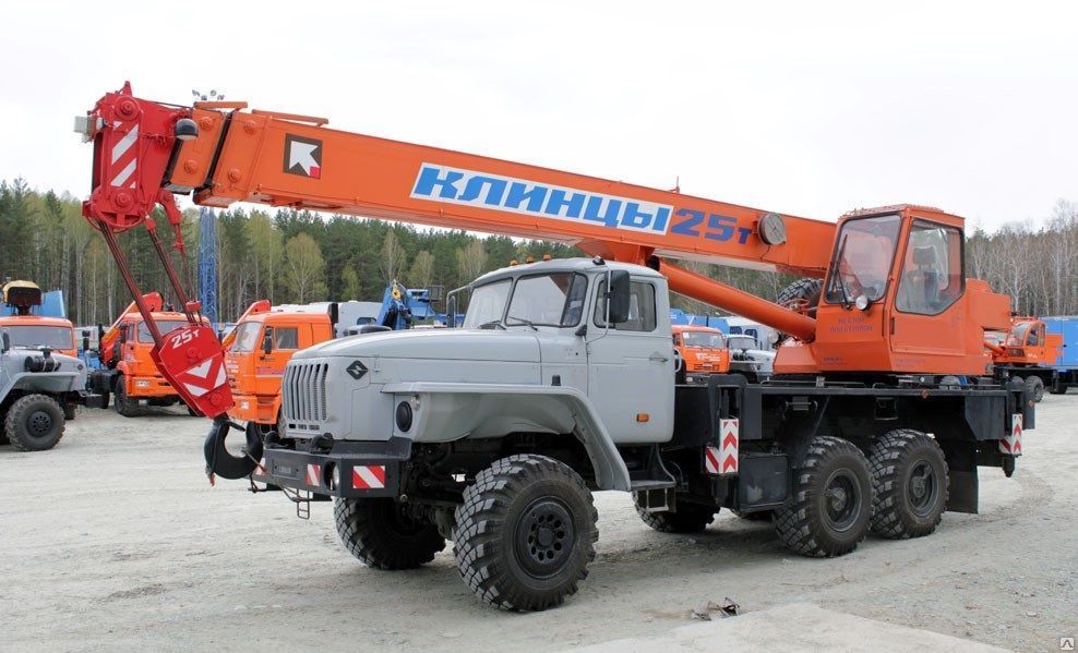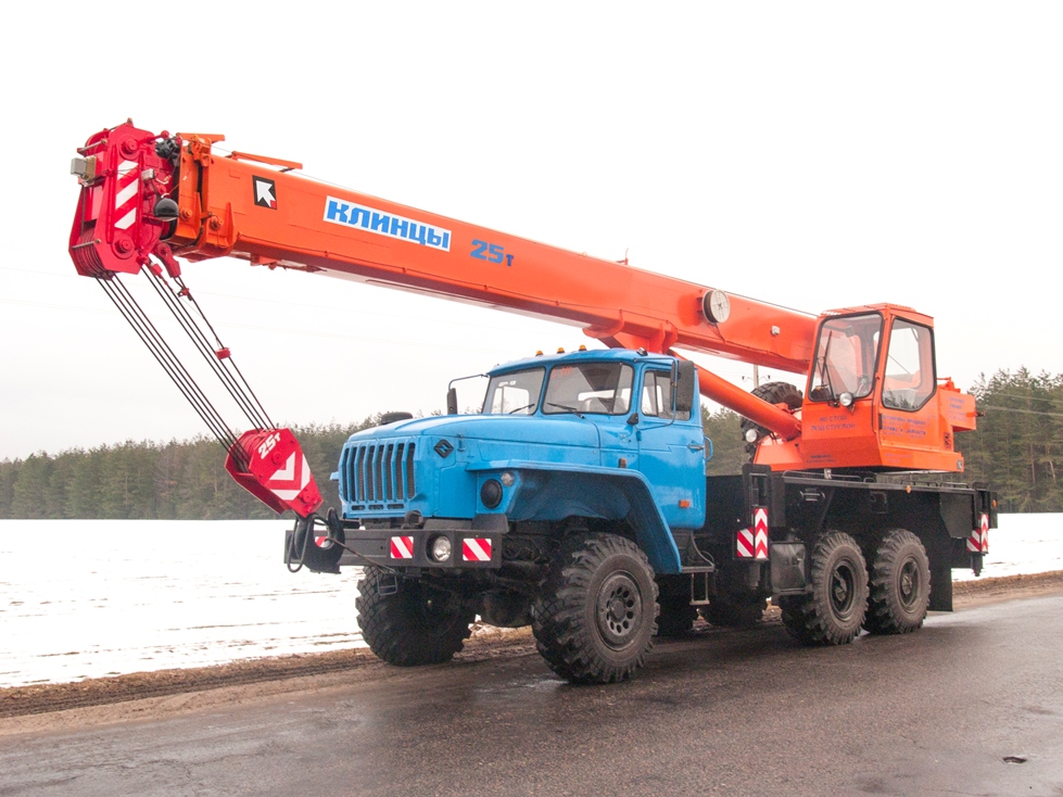Кран стреловой автомобильный КС-55713-3К-2 грузоподъемностью 25 тонн монтируется на шасси автомобиля Урал-5557. Предназначен для погрузочно-разгрузочых и строительно-монтажных работ на рассредоточенных объектах. Кран смонтирован на трехосном шасси автомибиля-вездехода Урал-5557, оснащенном системами регулировки давления в шинах и блокировки колесных дифференциалов. Система подкачки шин позволяет на ходу изменять давление в камерах колес в зависимости от дорожного покрытия, тем самым увеличивая проходимость машины. Высокая проходимость шасси позволяет использовать кран на объектах, находящихся в труднодоступных местах с плохими подъездными условиями, в том числе на строительстве нефте- и газопроводов, разработках месторождений.