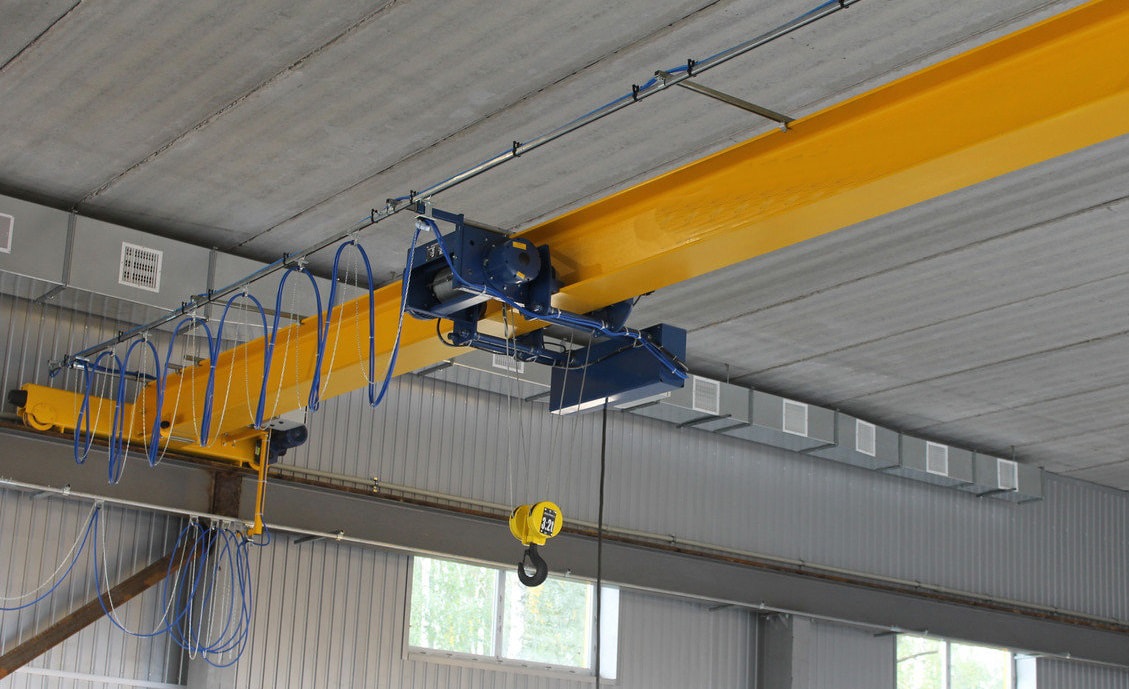 Мостовой кран однобалочный позволяет при недостаточной высоте подкрановых путей, но большого запаса высоты до перекрытия ферм значительно увеличить высоту подъема груза.