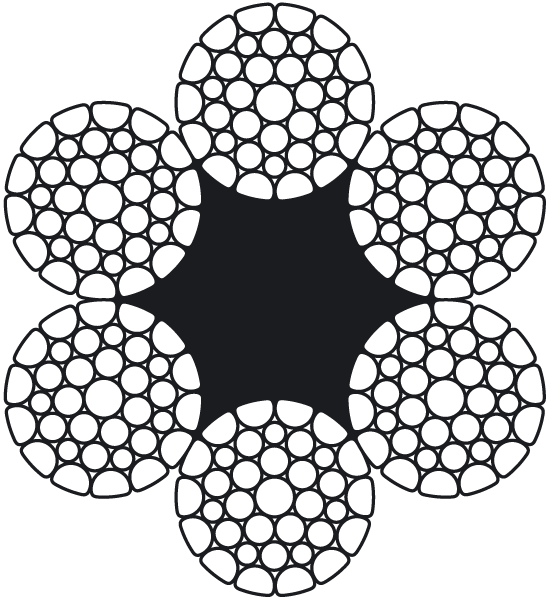 Talpa 6K (6-прядные канаты с пластическим обжатием наружных прядей и органическим сердечником СТО 71915393-ТУ 040-2007). Конструкция: 6хЗ6 + 1 о.с.