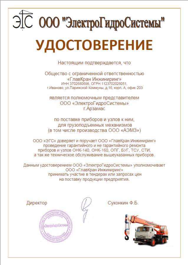 ГлавКран Инжиниринг официальный представитель ЭлектроГидроСистемы (ООО "АЭМЗ") г. Арзамас